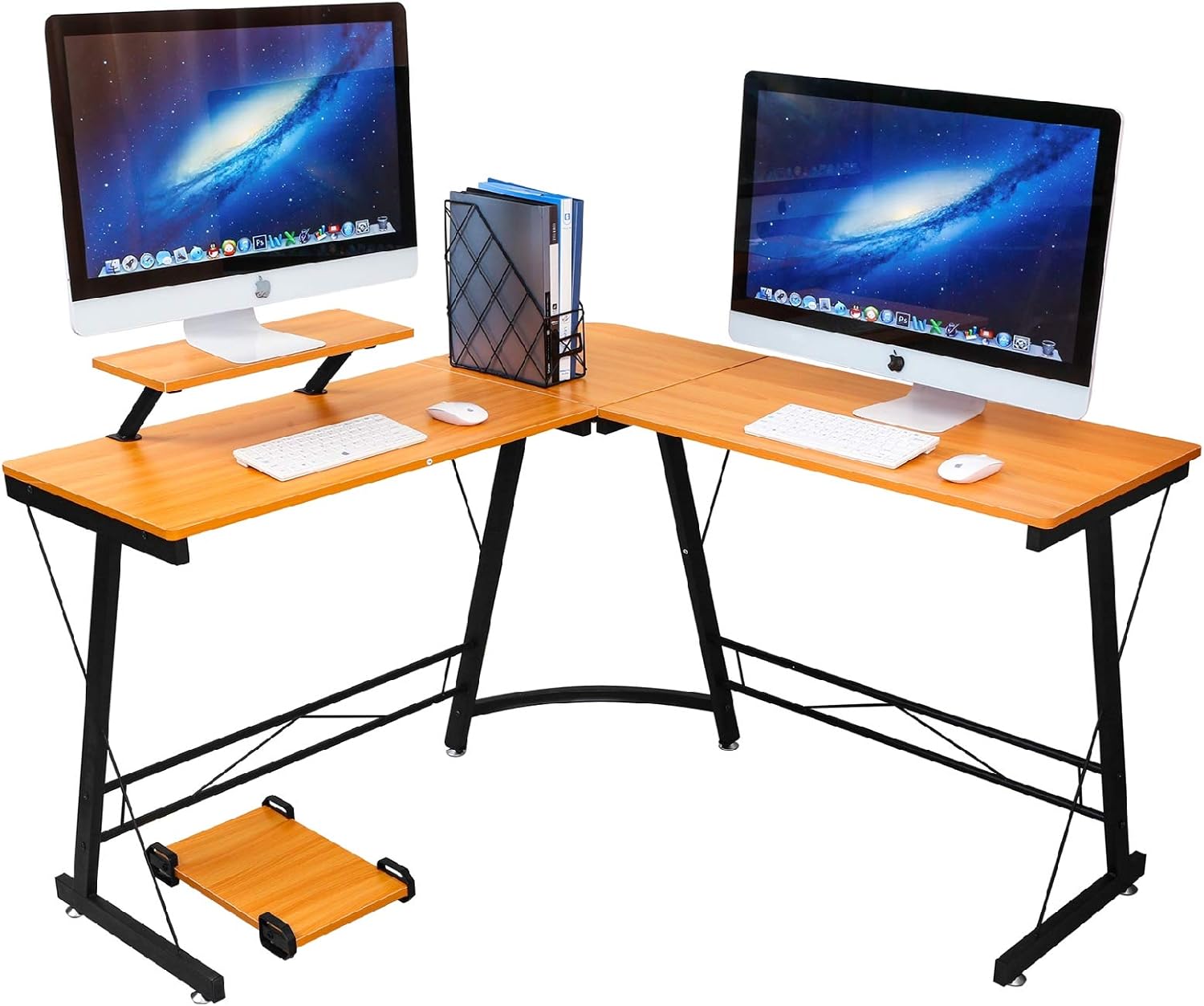 - 【Modern Nearly Full L-Shaped Computer Desk with Free Wide Monitor Shelf & CUP Stand】-Nearly full L Shape design,which offers a corner wedge for easy to maximize and create ideal workspace.Free monitor shelf of computer desk for your monitors leaves more surface space for your keyboard and mouse when gaming,study writing and other home office activities.It also comes with a free CPU stand that places freely underneath.